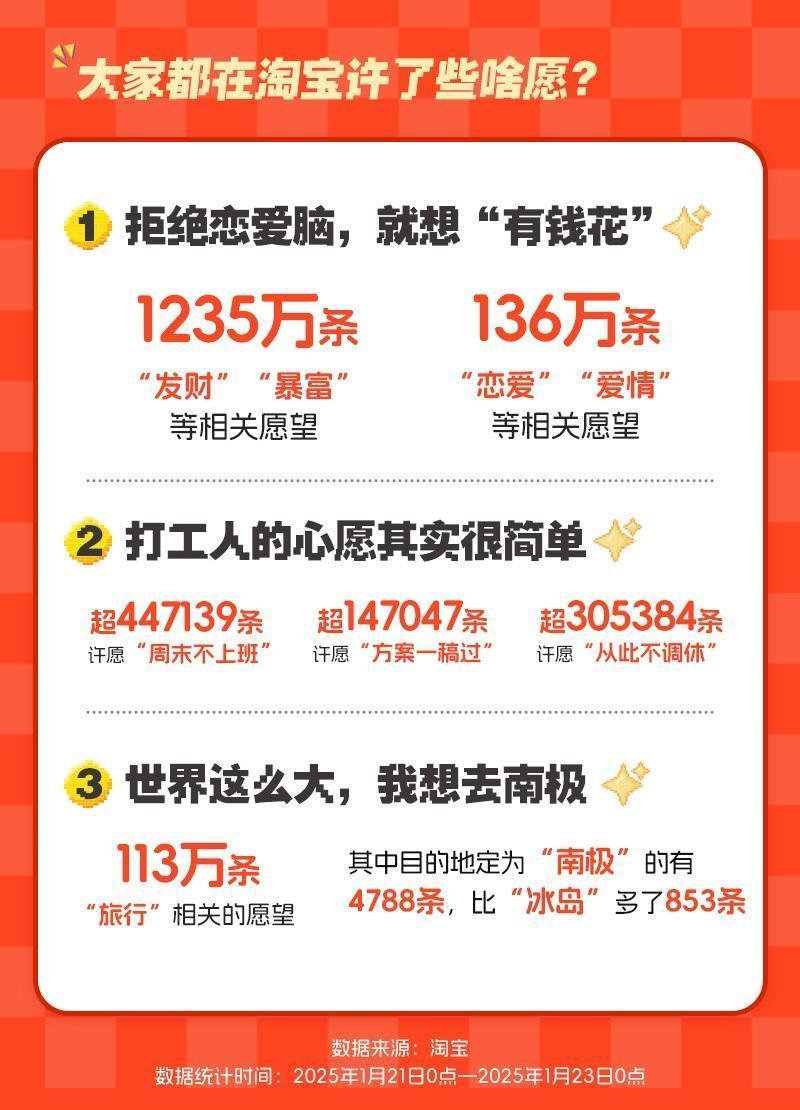 “世界这么大,我想去看看”,当年的这句网络热梗击中了多少打工人的心。淘宝许愿活动中,和“旅行”、“出去玩”相关的愿望有113万条,目的地选择上,南极和冰岛是两个较为普遍的。此外,“烂尾”、“塌房”成甚至有12个人许愿“希望胖东来能够开到全国各地”、有超过1000个人许愿“把甄嬛传剩下的14集都放出来”,这些活人感十足的愿望也都被淘宝记录下来。春节期间,上淘宝搜索“淘个好彩头”参与活动,许下心愿,就有机会获得红包和实物奖励,让更多的心愿被看见。举报/反馈