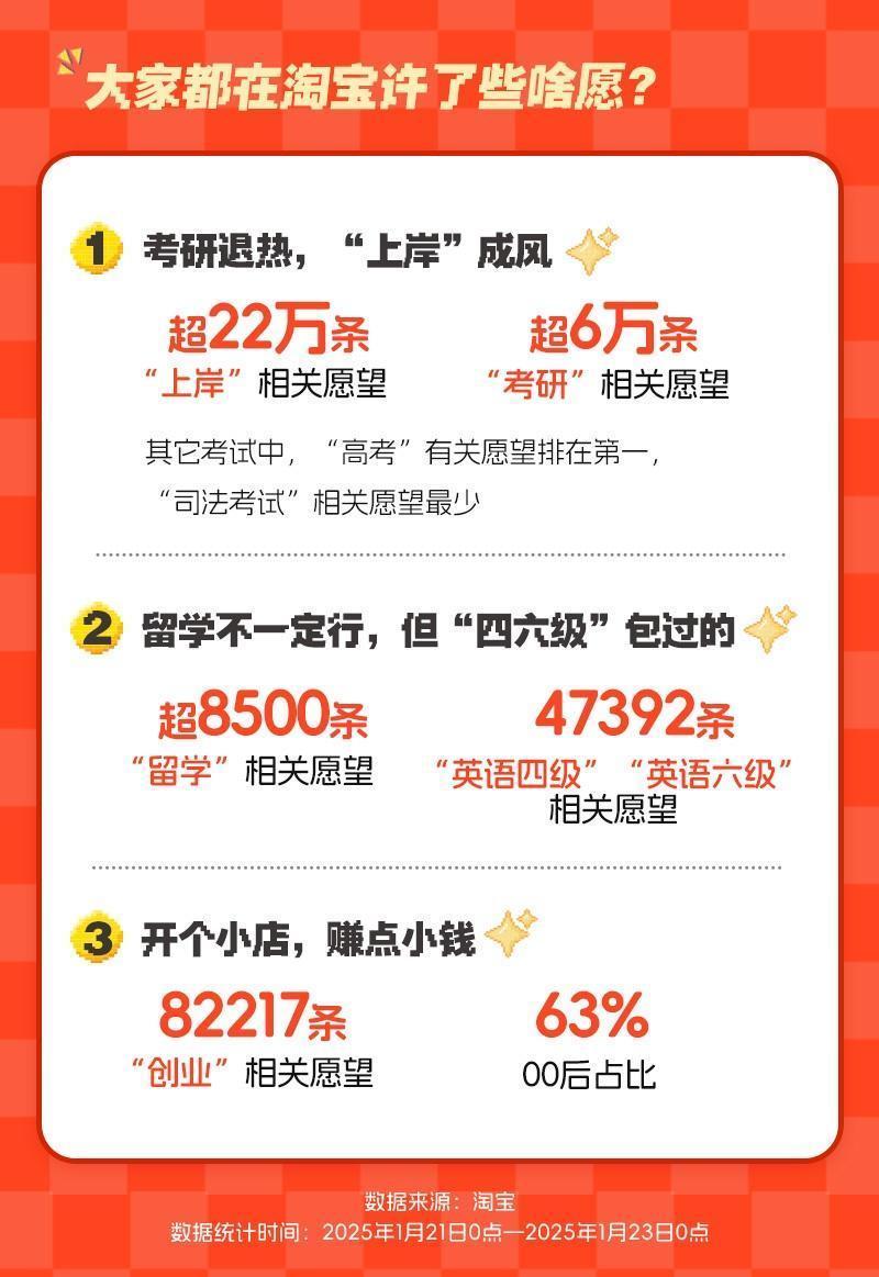 “我可以没有爱情,但我磕的cp不行”,这句话也从淘宝的许愿活动里得到印证。截至目前,42590个年轻人在淘宝“磕cp”,仅“我磕的角色原地结婚”这一条内容,就有19972次点亮。无论是热播剧中的角色、还是二次元世界里的纸片人,哪怕是从玻璃渣里找到糖,这种甜甜的破碎感也足以慰藉cp党们一整天。想“上岸”的心从来没有那么强烈淘宝的许愿数据显示,“上岸”是所有自定义愿望中,断层排名第一的,有超过20000人在手机上键盘上敲下“上岸”的愿望,同时,淘宝定制的“新年上岸”这一条愿望,也被点亮了77526次。在一众期待“上岸”的考试中,“考公”热度居第一位,其次是考研,CPA(注册会计师)的热度远超司法考试。此外,在语言类的考试中,希望通过“四六级”的愿望远超“托福”、“雅思”。